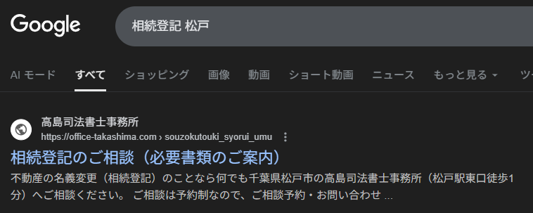 「相続登記 松戸」で検索すると、相変わらず「相続登記の必要書類」のページが最初に出てきてしまいます。